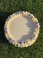 Ophelia is a buttercream white cake adorned with romantic green vines and purple roses
